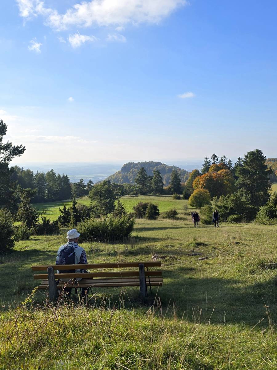Von dort wanderten wir durch den Wald zurück auf die Albhochfläche zum Aussichtspunkt Heersbergblick inmitten von Wacholderheiden, der mit seinen Ruhebänken mit Weitblick zum Verweilen einlädt. Da die Zeit schon fortgeschritten war, entschied sich die Gruppe gegen einen Abstieg ins Felsenmeer, für das die Gegend bekannt ist. Wir wanderten lieber zurück nach Burgfelden und manche gönnten sich noch ein Eis to-go vom Berg-Café.